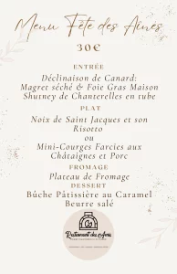Le menu propose 2 options pour le plat principal : soit coquilles St Jacques soit mini courge farcie ( à préciser lors de l’inscription)